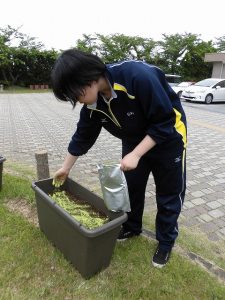 昨年度から取り組むカンパニー活動「カーボンニュートラルを学ぶ」の取り組みとして、種子油の抽出を目的としてひまわりの種を植えました。今回も市販の培養土とユーグレナを混合した培養土の2種類の土で生育状況について観測します。夏には満開のひまわりが前庭を華やかにしてくれることを期待しています。