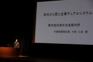 大久保校長の開会の挨拶の後、41名の生徒がそれぞれの学びについて発表しました。企業デュアルシステム(企業施設での通年実習)の発表では、受入企業を代表して㈱清水合金製作所 代表取締役社長の小田仁志様から「会社からみた企業デュアルシステム」についてお話いただきました。