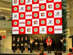 一年生を対象とした授業の一環で、株式会社平和堂・キリンビール株式会社(彦根工場)・株式会社ブリヂストン彦根工場の三3社協働の「彦根発 笑顔いっぱいプロジェクト」内の企画である【彦根の次世代を担う学生たちの街おこしの夢を応援!!】に応募しました。生徒たちは、彦根を活性化させるためのアイデアを考案して応募し、その中から本校のひと組のプラン「移動販売を通して地域の観光名所を活性化したい」が一次審査を通過し、他校生による「鮒ずしを広めたい」という企画と融合し最優秀賞に選ばれました。